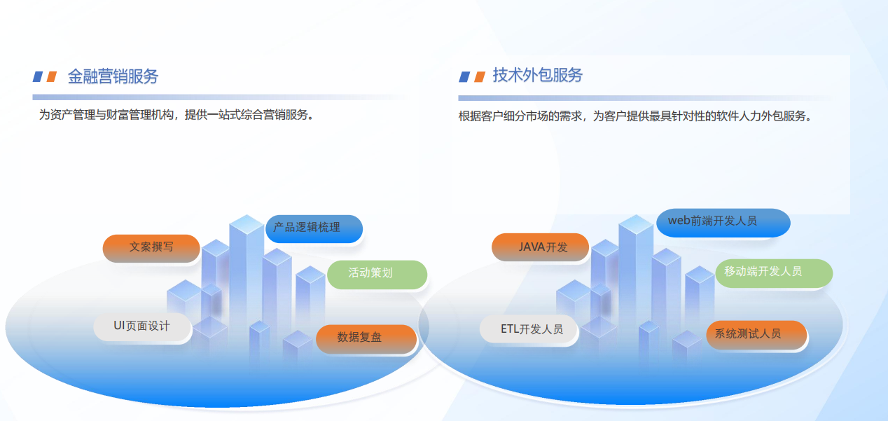 外包駐場服務?: 提供金融IT技術人力外包及營銷運營支持,涵蓋開發、測試、設計等領域。